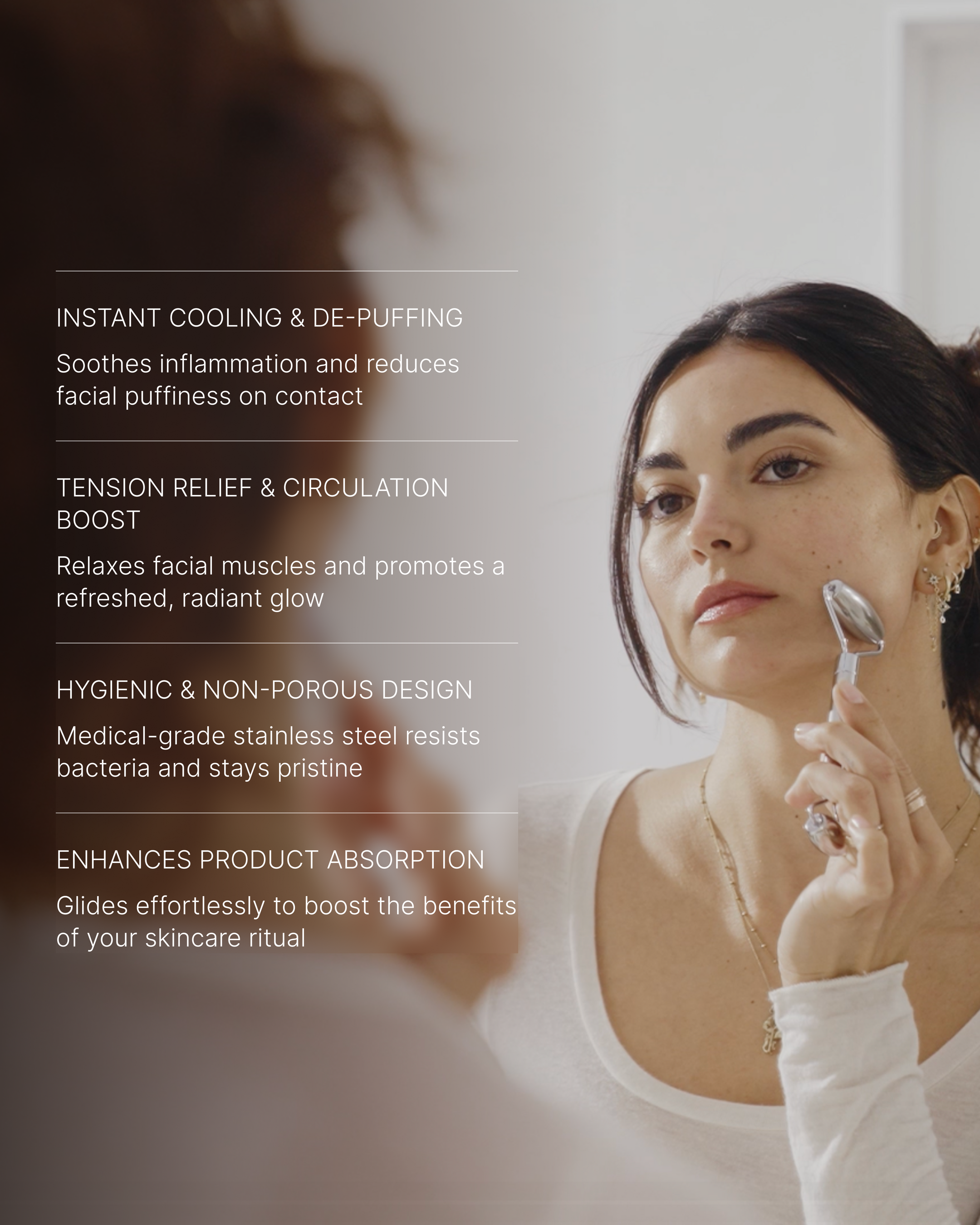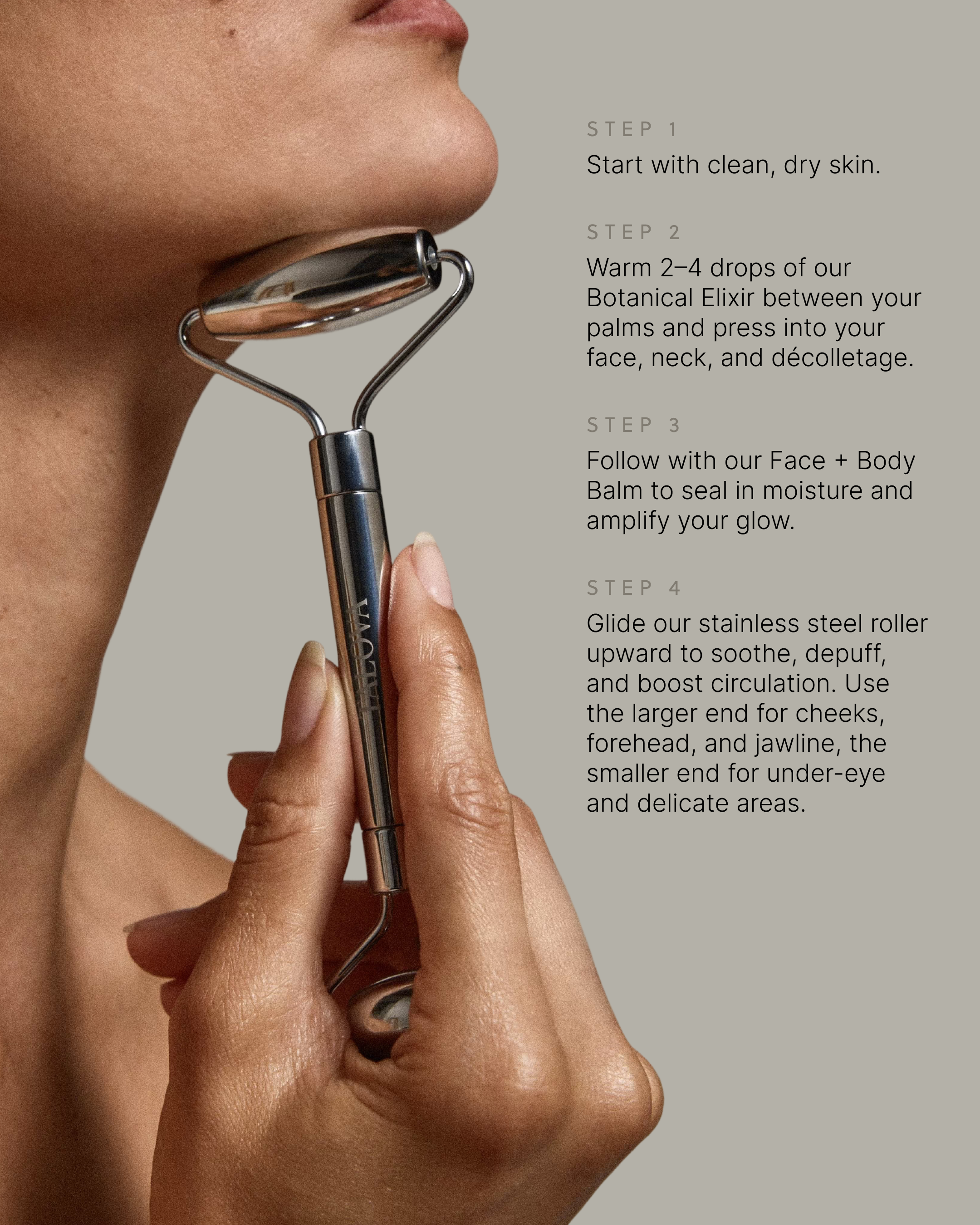 • Glide our stainless steel roller across your skin using gentle, upward strokes to soothe, depuff, and boost circulation. Use the larger end for cheeks, forehead, and jawline, and the smaller end for under-eye and delicate areas.