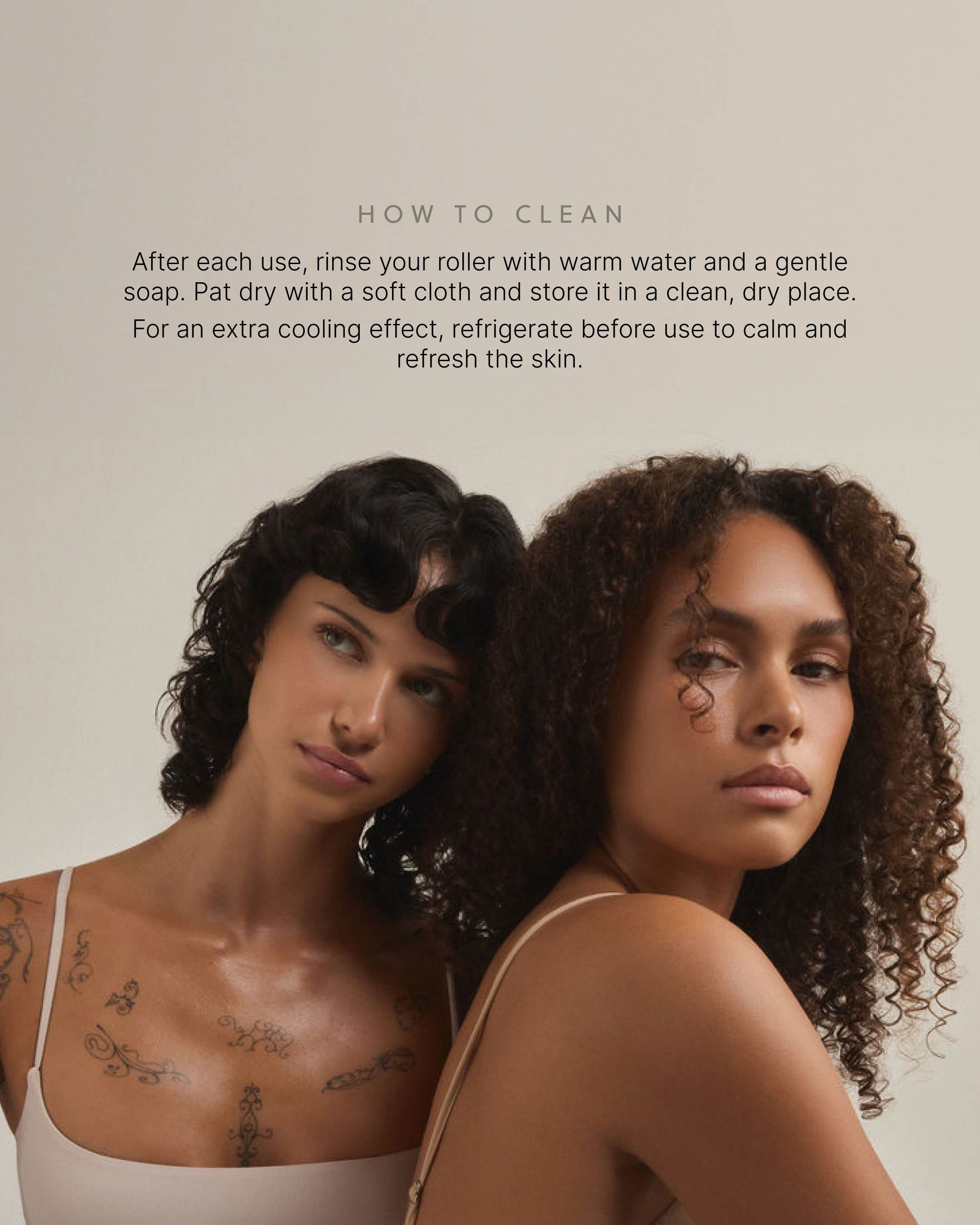After each use, rinse your roller with warm water and a gentle soap. Pat dry with a soft cloth and store it in a clean, dry place. For an extra cooling effect, refrigerate before use to calm and refresh the skin.